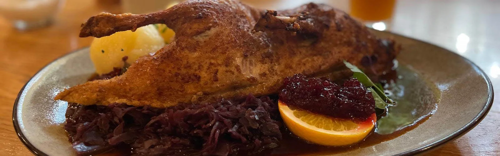 Crispy fried, served with red cabbage, potato and bread dumplings, cranberry pear, and duck sauce